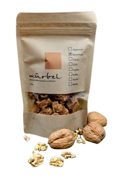 Unser Baumnuss Mürbel verbindet cremiges, handgekochtes Milchcaramel mit fein gerösteten Schweizer Baumnüssen. Das Ergebnis: ein zart schmelzendes Caramel mit kernigem Biss – perfekt für alle, die authentische Schweizer Spezialitäten lieben.
